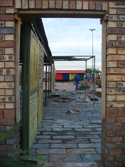 Today the site was alive with activity and many hands and new faces eager to help the Slovo Building Team, reach their Six Week Goal. The paving was quickly laid, after arriving at site at 10:00pm the previous night. A special thank you must be given to all the soccer fans who abandoned their vuvuzelas,and drinks at the local taverns and came to offload 10 000 pavers till  00:30 AM in  the morning.
